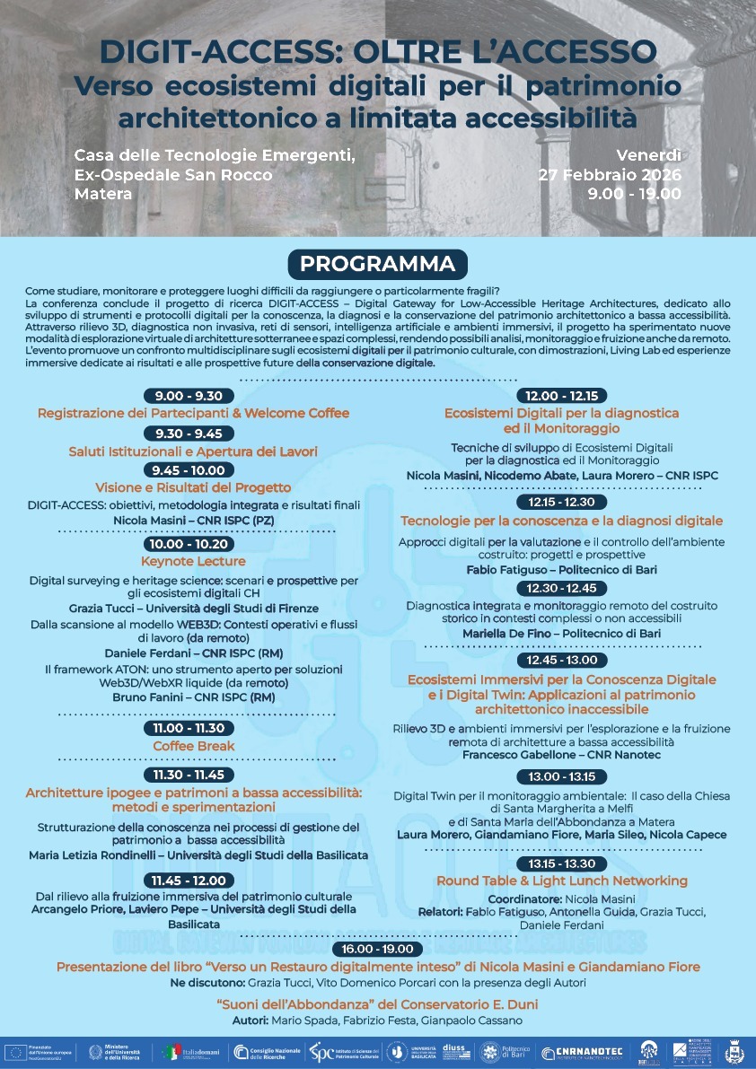 In this regard, the research aims to test and validate a set of operational protocols and digital tools for the use of reality-based environments and models toward implementation and querying of diagnostic data from experimental investigations and analytical processing, on-desk control of real-time on-site data from environmental and structural sensor networks, application of image-processing routines and machine learning methods for identification of degradation patterns, visualization of informative contents and digital products by VR/AR environments. The result is a DIGITal gateway to support processes of knowledge, diagnosis, and evaluation of heritage, with particular attention to low ACCESSible architectures, validating it on representative case studies of underground architectures in Southern Italy.